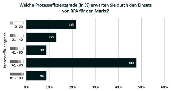 Währenddessen erwartet die Mehrheit der Befragten deutlich höhere Prozesseffizienzgrade durch den Einsatz von RPA für den Markt. Knapp die Hälfte der Teilnehmenden vermuten zum Beispiel, dass die Prozesseffizienz um 60 bis 80 % steigen wird (vgl. Abbildung, Quelle: BEMD, 05/2021).